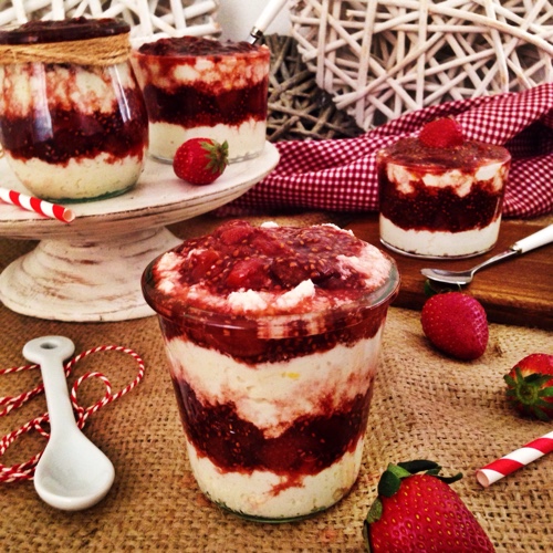 When berries have cooled enough, spoon into serving glasses, alternating the cream and jam.