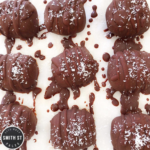 Use a fork to dip and roll the coconut centres in the chocolate. Place back on the paper lined tray. Then repeat the dipping and coat them a second time. Place back on the paper lined tray and set in the fridge.