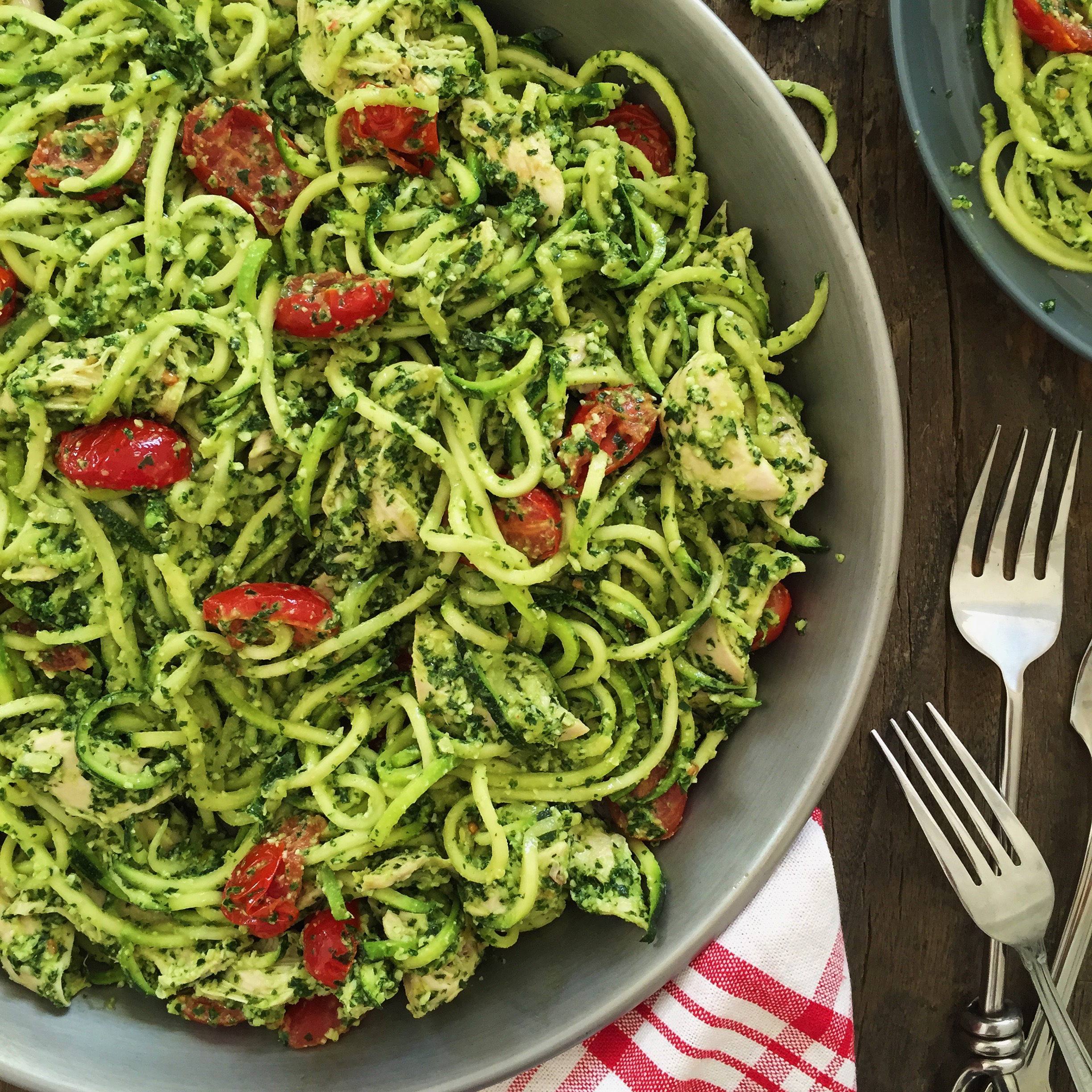 Add the cooked chicken and tomatoes to the ‘zoodles’ along with a serving of pesto. Coat everything well and serve.