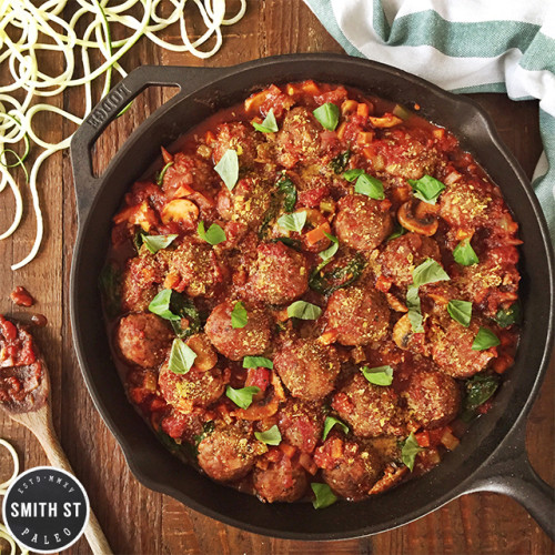It took me ages to decide what to name this dish…..just kidding! These bad boys contain tomatoes, basil and Balsamic vinegar, call me predictable but I think it was pretty obvious where we were going here. These are a pretty stock standard mid-week meal at Casa Smith. Super easy to knock together and makes brilliant leftovers for lunch. They also freeze well. Serve them on top of zoodles, courgetti, vegetti or whatever fancy pants name you give your spiralized veg (I’m partial to making mine with sweet potato – are swoodles a thing??)
