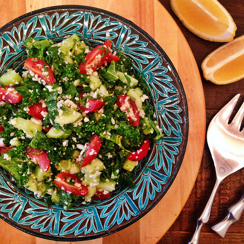 Tabbouleh is a popular Arabic dish, traditionally served as part of a mezze. Variations of it are found also in Turkey, Cyprus and Armenia. I’ll admit it’s pretty good for you as it is, so I’m not reinventing the wheel here, however I have changed up a couple of things which take it from healthy to super salad. I’ve removed the offending bulghur wheat and replaced it with raw cauliflower and pumped up the greens with the power of kale.