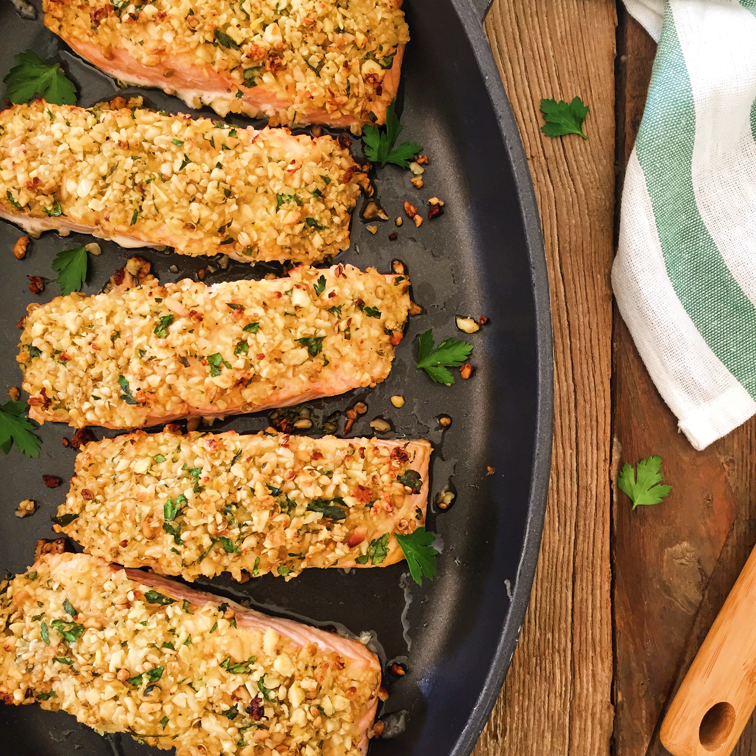 I love me some salmon for my din dins! Not only is it the tastiest darn fish on the market, but packs some powerful health punches to boot. Got some fussy fish eaters at your digs? Convince them to chow down on those Omega 3’s by sticking some nuts to those pink pieces of piscatorial nutrient bombs. They don’t care about the health benefits? Lucky this dish delivers on flavour too, so you’re home and hosed.