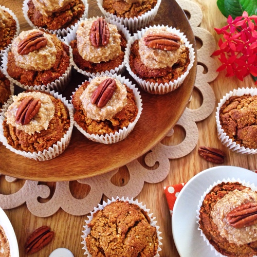 Put a spoonful on top of each muffin when they are cooled and pop a pecan on top.