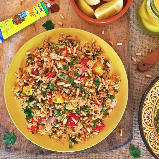 This recipe makes one giant bowl of cous cous, good for feeding a crowd. If you want less, just halve everything. Duh.