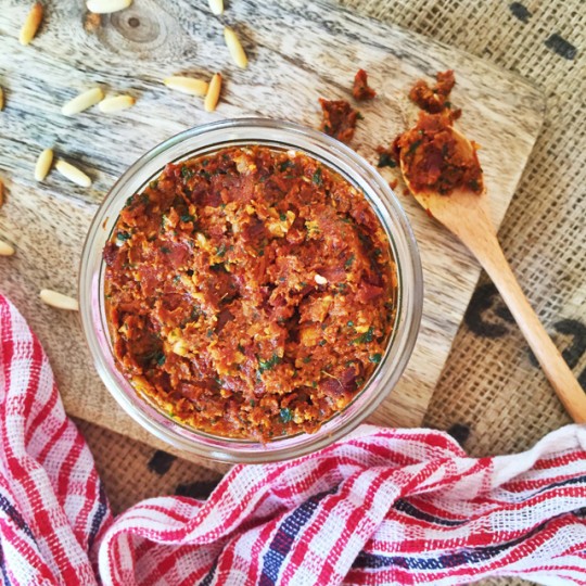 Here’s some good advice from me to you. When you have a spare 5 minutes (because that’s all you need) , whip up a batch of this stuff and have it on hand to turn your meal from ho-hum to kick-arse any day of the week. Seriously, spread this stuff everywhere! Bored with salmon?? Chuck this on it and bake it. Plain old chicken?? Stuff that breast with the good stuff, wrap it bacon, and voila, gourmet. Embracing your inner Hippie? Toss it through some veggie noodles for a meat-free meal. Or just grab some carrot sticks for your arvo snack. Ahh pesto, you’re the besto!! I used dry sun-dried tomatoes for this recipe which I soaked in water for 30 minutes, but I’m sure the jarred ones would work fine as well, just drain them off first.